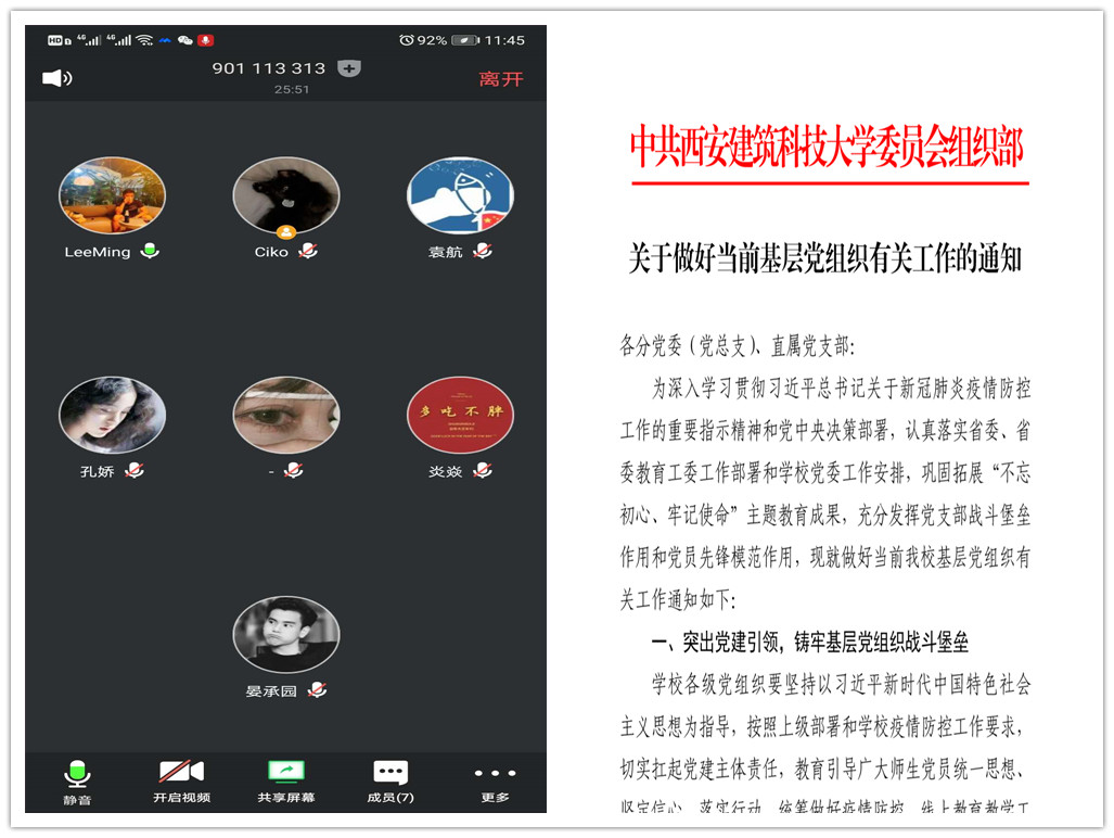 学生党支部“守初心、担使命、战疫情、促发展”主题学习推进会在线上进行。学院学生与校友工作办公室主任李明、学院团委副书记徐毅、2019级辅导员袁航以及各学生党支部书记和支部委员参加了会议。