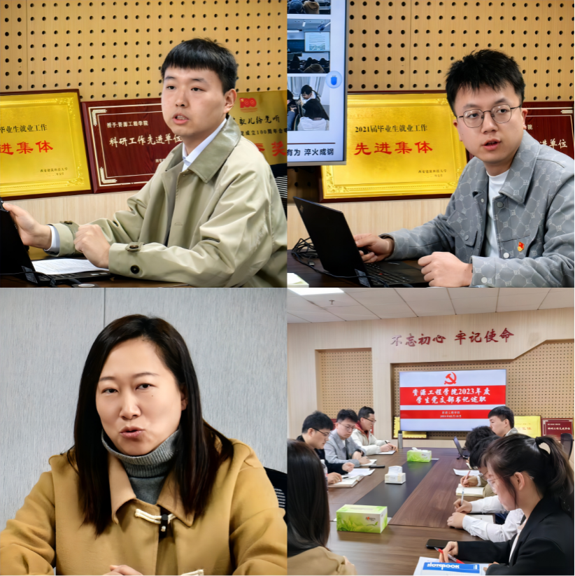 会上,各支部书记结合所在支部的工作特点,围绕支部基本情况、组织生活开展、支部战斗堡垒作用发挥、当前存在问题及未来展望等方面对2023年度工作内容进行汇报,并对学生支部党建突出问题进行分析。其中,本科生第一党支部书记和郑翔介绍了支部“1+2+N”党建工作体系,通过聚焦理论武装、聚焦制度落实、聚焦责任落实发挥支部战斗堡垒作用,助力学院学风建设工作走深走实。本科生第二党支部书记周宇浩强化思想理论学习,开展“五个实践”活动发挥支部战斗堡垒作用,营造优良学风氛围,助力学生成长成才。安全专业研究生党支部书记刘飞介绍了支部“3+3”管理制度,通过强理论、重实践、凝力量,发挥学生党员先锋模范作用,打造学习型、服务型、学术型“三型”党支部。采矿专业研究生党支部书记周泽凯深化基础党务工作,将理论学习与实践学习深度结合,激发支部党建活力,助力研究生学术科研。矿加专业研究生党支部书记杨丽静打造“1+2+3”支部党建工作体系,通过一条主线、两大注重、三项提升,实现理论学习“强本领”、支部建设“强落实”、党员管理“强服务”。
