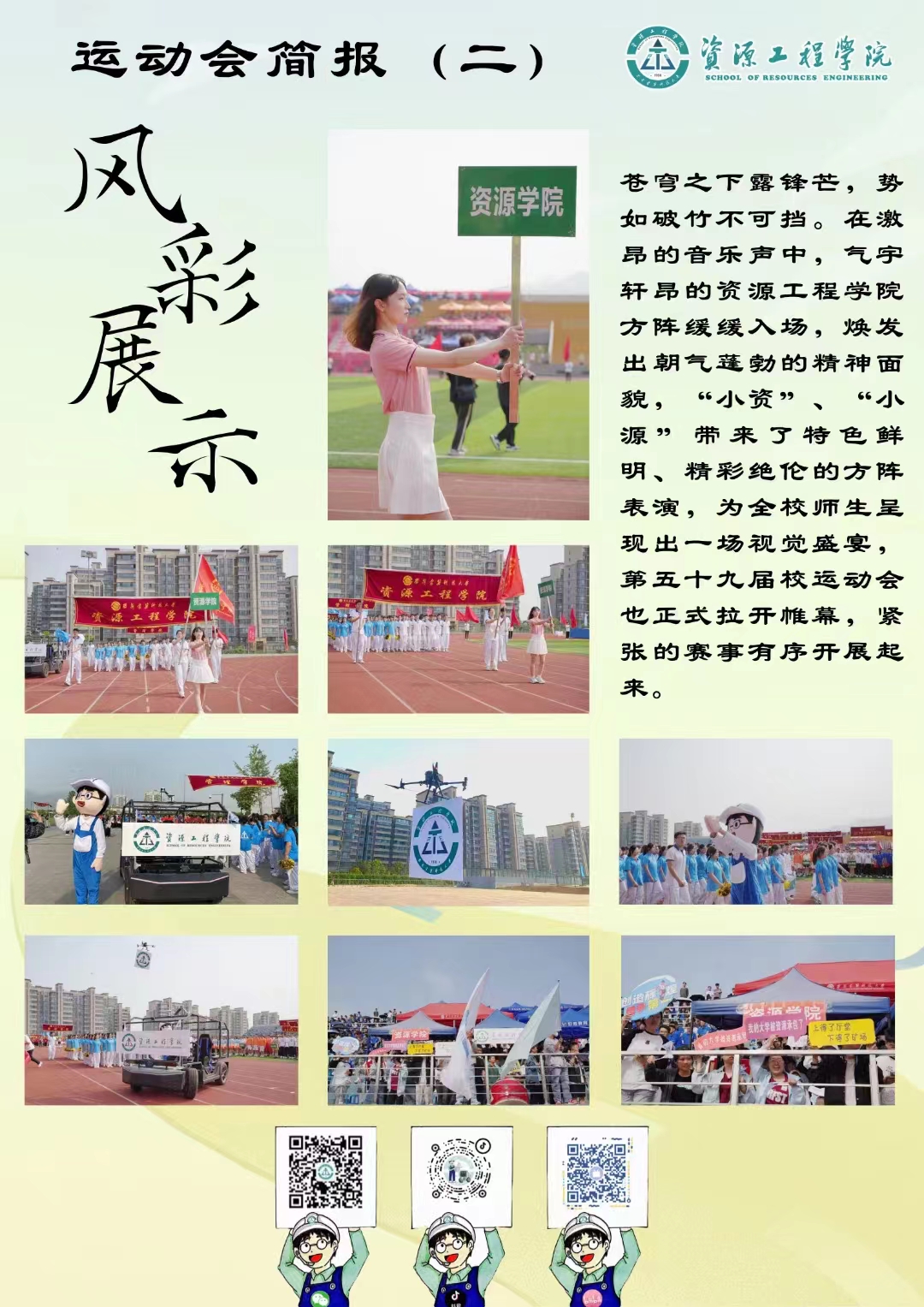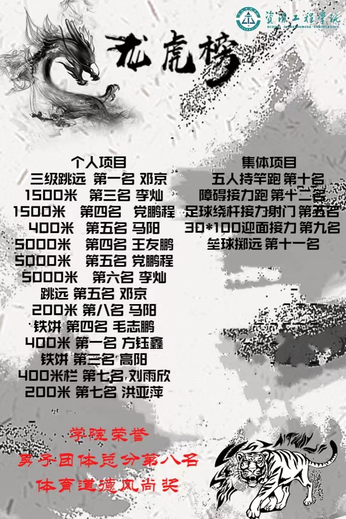 师生共参与了30个项目的角逐,激荡起体育强国的春潮!青春逢盛世,奋斗恰合宜,欢呼与呐喊交织,拼搏与汗水相碰,在全体师生的共同努力下,资源学院一举斩获了男子团体第八名、体育道德风尚奖。
