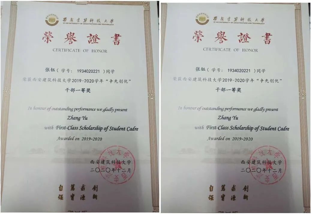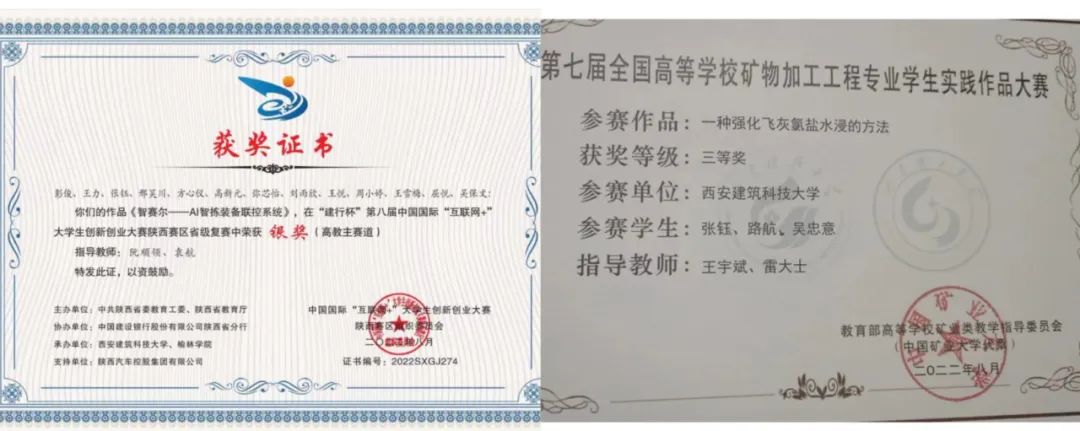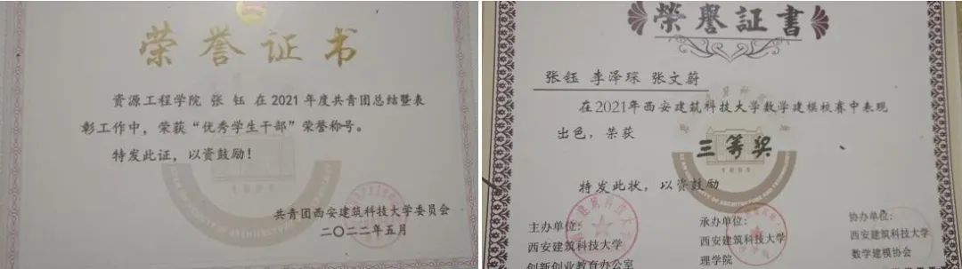 矿物加工工程专业,获推荐免试研究生资格。累计获得国家励志奖学金3次,“争先创优”一等优秀学生干部1次,一等优秀学生1次,长枫建设集团“企业奖学金”2次、“日常服务优秀志愿者”荣誉称号。在双创竞赛中,获得第七届全国高等学校矿物加工工程专业实践作品三等奖、第八届中国国际“互联网+”大赛省级银奖、第十二届数学竞赛陕西赛区三等奖、数学建模校赛三等奖。