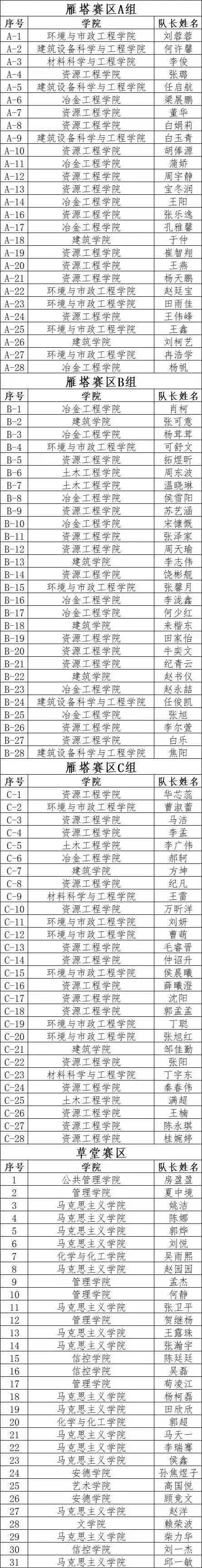 下午15:00,各学院参赛选手进行了现场抽签,初赛环节雁塔校区分为A组、B组、C组,共三组,均为28支队伍,草堂校区1组,为31支队伍。抽签过后产生了本次比赛初赛环节参赛选手的出场顺序,结果公布如下: