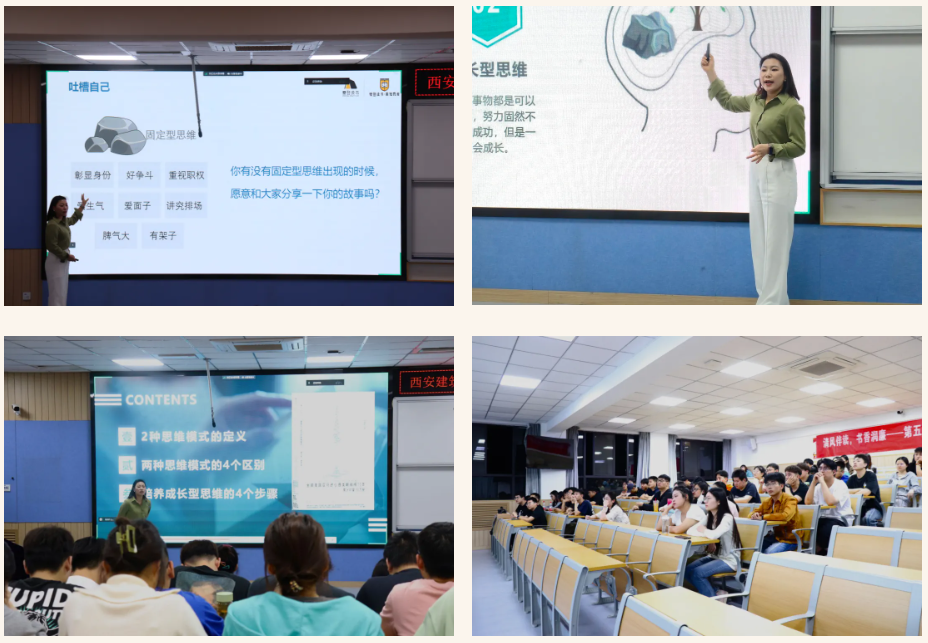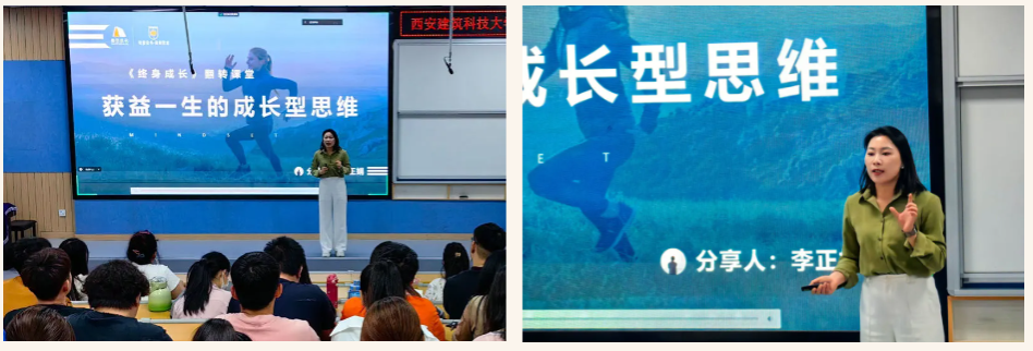 首先,李正娟老师从自身经历为同学们展开以《终身成长》为主题的反转课堂,自我介绍不仅仅是展现自我的手段,同时是认识自我的手段,是快速拉近人们之间距离的手段。接下来,李老师从2种思维模式、两种思维模式的4个区别和培养成长型思维的4个步骤三个方面讲述本次分享会的主题。