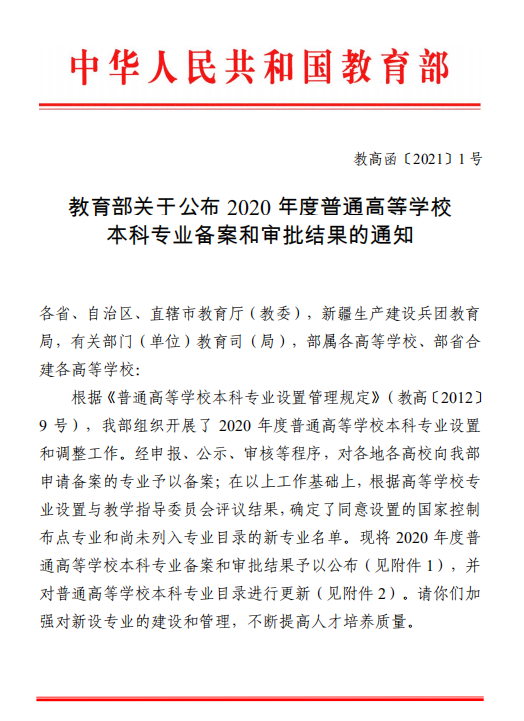 近日,教育部下发《关于公布2020年度高等学校本科专业备案和审批结果的通知》(教高函[2021]1号),公布了2020年度普通高等学校本科专业备案和审批结果,小狐狸视频 新增大数据管理与应用专业,目前小狐狸视频 本科专业已增至4个。
