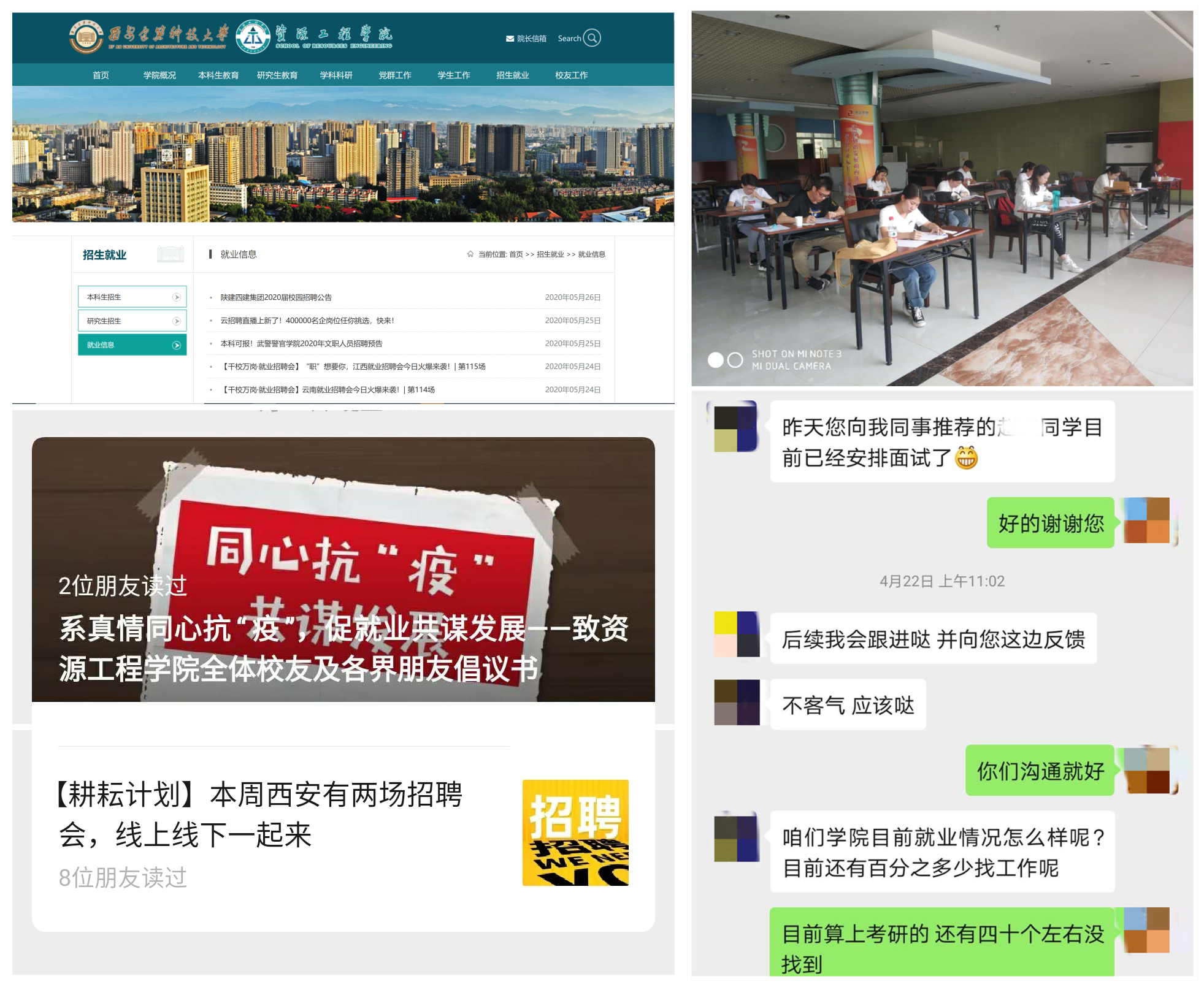 提前研判,多途并进畅通渠道。学院多渠道进行线上信息发布,加强学院官网、微信公众号相关板块建设,持续推进2020届就业交流微信群维护,确保招聘信息传递不滞后;发布《系真情同心抗“疫”,促就业共谋发展——致小狐狸视频