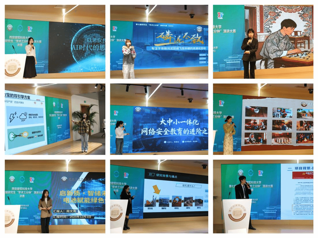 本届比赛积极响应国家创新驱动发展战略,设立“启新质——前沿科技与新质生产力理工科赛道”与“筑新篇——哲学人文管理社科赛道”,共吸引来自校内16个学院的330余名研究生踊跃报名参赛。经过初赛的选拔,共有来自土木学院、环境学院、建科学院、管理学院、冶金学院、信控学院、资源学院、文学院及马克思主义学院等9个学院的25组选手入围决赛。赛前,西安电子科技大学特邀嘉宾硕士生杨子涵与博士生闫浩浩分别就无人机集群协同控制、癌症早期诊断进行学术演讲,为学生搭建起学术交流,互学互鉴的良好平台。
