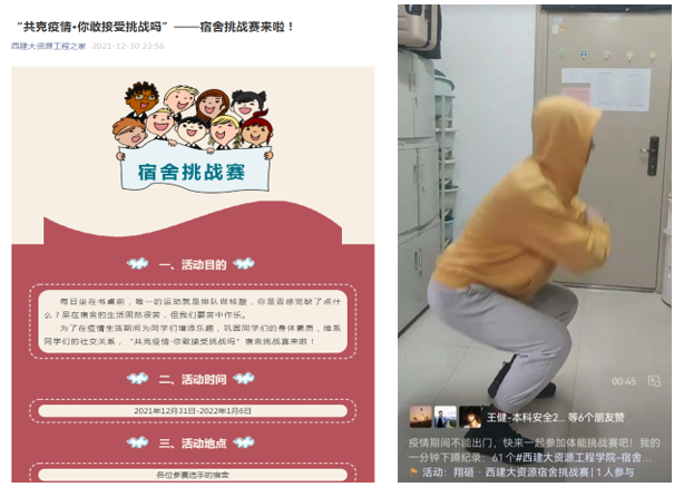 开展“共克疫情,宿舍运动挑战赛”,以发起运动挑战的形式让学生在锻炼身体的同时实现与同学、老师之间的线上交流,在一定程度上增加了同学们宿舍生活的乐趣。