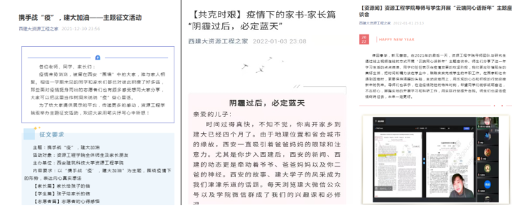 关心学生心绪状态,情感抒发有方法。严峻的疫情形势下,为让家长放心、让学生安心,学院开展了家书征集活动,引导学生写下近期所感所想,向父母倾诉,也鼓励学生家长以文字形式与学生交流感情,以此形成学生和家长联系的另一条情感纽带,让资源学子从中汲取力量,传递更多正能量,现已收到5封家书。与此同时,学院持续强化班主任、导师职责,推进“资源家文化”建设。在2021年最后一天,组织各班班主任、研究生导师、辅导员与学生齐聚网络开展“聚同心·共抗疫·勇担当·展形象”、“云端同心话新年”、“守望相助抗疫情,关心关爱见真情”等主题线上元旦联欢活动,关心关注学生在宿舍学习生活及心理健康状况,传递“资源亲情与温情”。