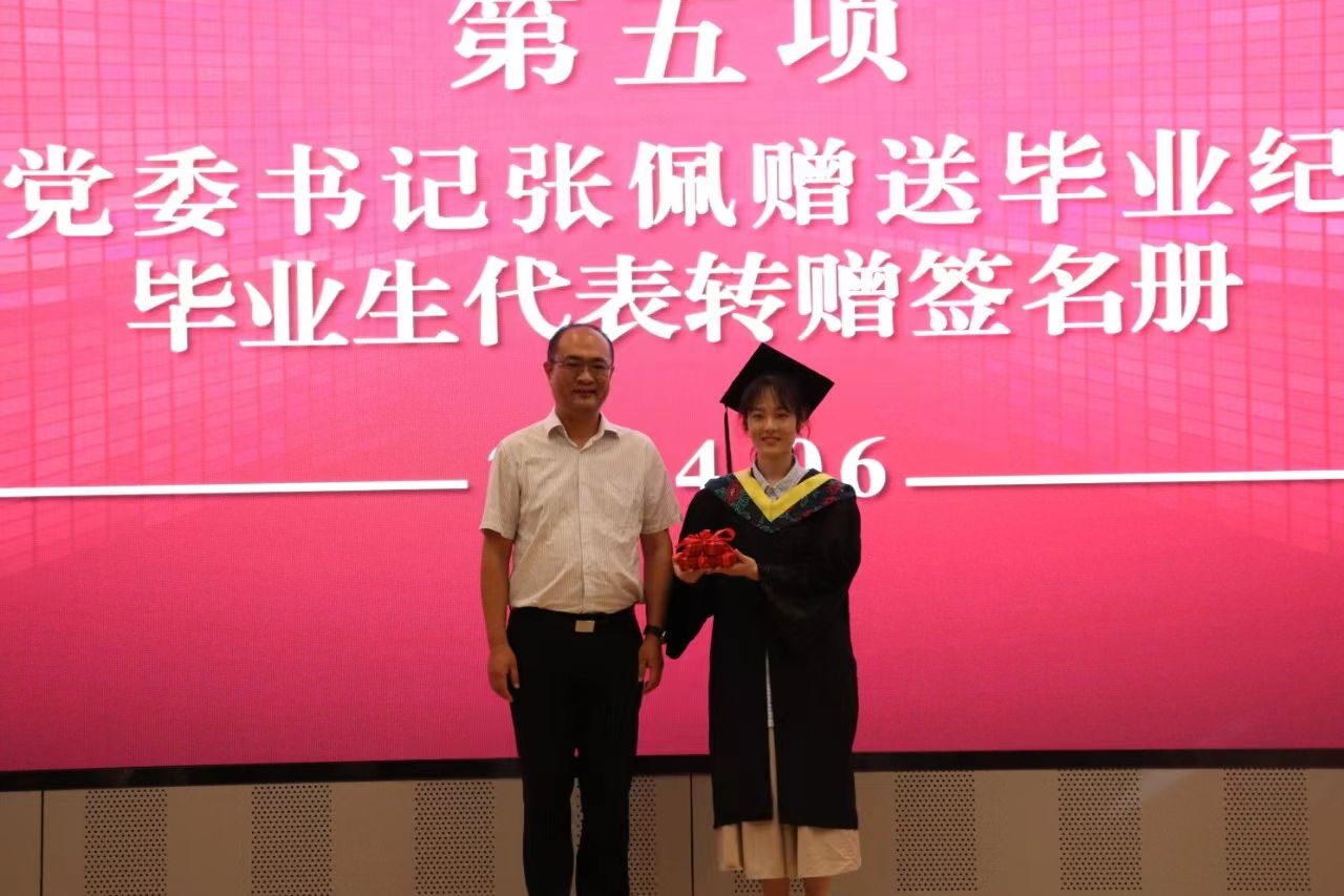学院党委书记张佩代表学院向毕业生赠送了毕业纪念章,安全工程2001班王雪梅作为毕业生代表接收纪念章。资源研2105班赵坤庆代表全体毕业生向学院呈递《毕业签名纪念册》,张佩代表学院接收《毕业签名纪念册》。