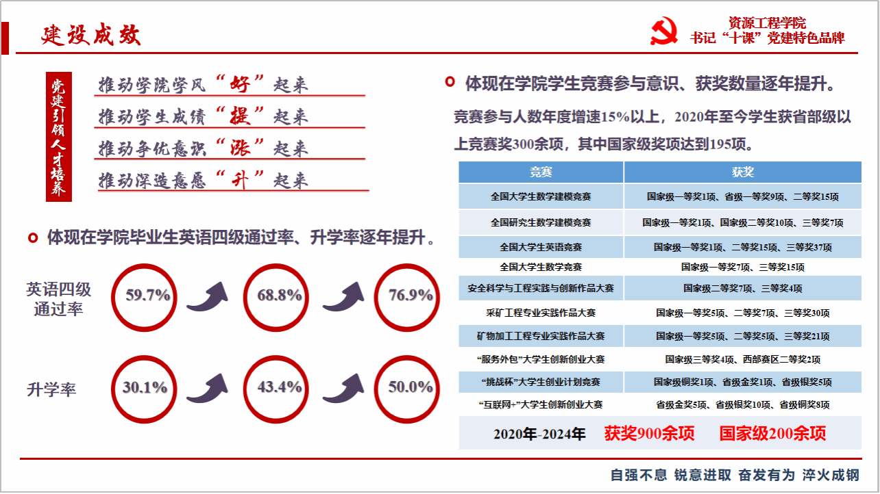 五年来,“书记‘十课’”党建品牌建设思路和体系在持续迭代中优化,育人良好趋势基本形成。党建引领人才培养,推动学院学风“好”起来,推动学生成绩“提”起来,推动争优意识“涨”起来,推动深造意愿“升”起来,最终实现育人成效的良好态势滚滚向前推进。一是体现在英语四级通过率、考研升学率逐年提升,毕业生四级通过率从2020届的59.7%到2021届的68.81%,再到2024届的76.97%;本学期2022级、2021级本科生CET4累计通过率分别位列全校6、7位;升学率从2020届的30.1%提升到2024届的50.0%,其中28名学生录取至北京理工、中南大学、重庆大学等“双一流”高校,升学率、升学质量双提升。二是体现在低年级本科生基础课程成绩显著提升,2022级陕西生源本科生大学英语平均分提3个位次、高等数学平均分提升7个位次,提升数均位列全校第1,其中《高等数学Ⅰ-A1》、《高等数学Ⅰ-A2》课程平均分均位列全校第3。三是学生竞赛参与意识、获奖数量逐年提升,学生双创竞赛参与人数年均增速达到15%以上,2020年至今,学生获省部级以上竞赛奖项300余项,其中国家级奖项达到200余项。
