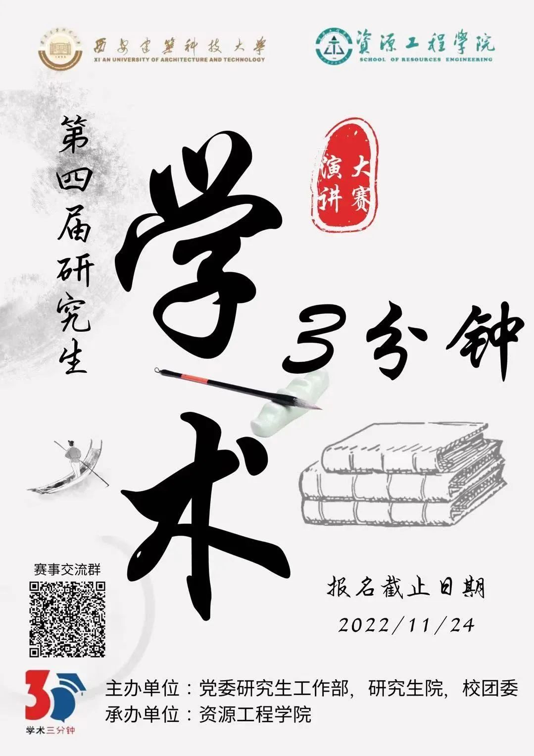 为锻炼我校研究生学术表达能力,促进优良学风建设,充分调动广大研究生科技活动的参与热情,激发其科研能力、创新能力和团队合作能力,学校定于2022年11月至2022年12月举办第四届研究生“学术三分钟”演讲大赛,现将有关事项通知如下: